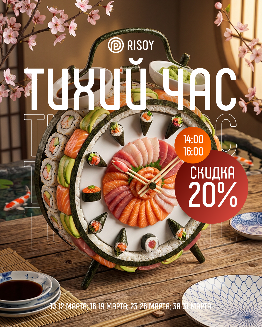 «Тихий час» в Risoy - это 20% скидка с понедельника по четверг с 14:00 до 16:00 на всё меню при заказе на самовывоз или в зале!
